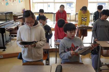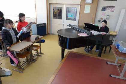 原村交流に出かける5年生に「スキーの歌」を指導してくださっています。