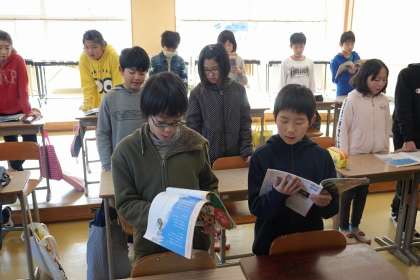 原村交流に出かける5年生に「スキーの歌」を指導してくださっています。