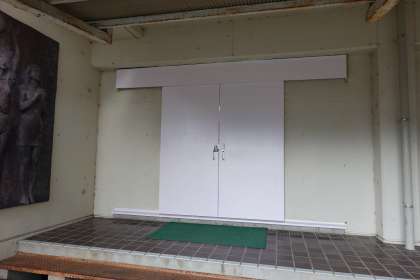 向かって左の扉はペンキ塗り立て、右はこれからです!