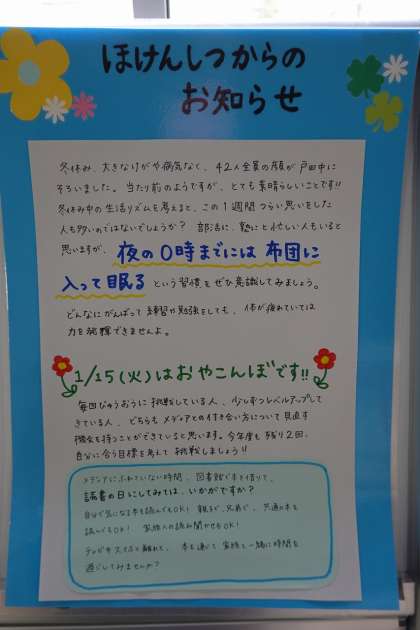 「朝、眠い」「起きられない」・・・そんな生徒の皆さんは、しっかりと保健室からのお知らせを読んでください。