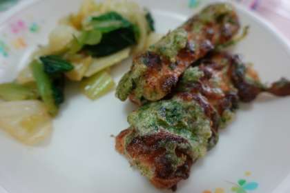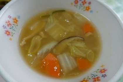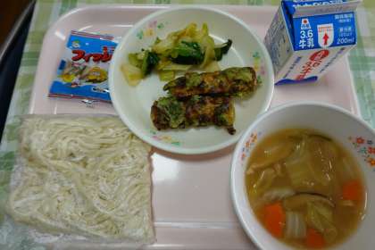 力うどん、牛乳、ちくわの天ぷら、キャベツのからしああえ、アーモンド小魚