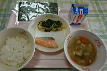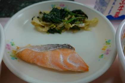 セルフおにぎり、牛乳、焼き塩鮭、キャベツのごまあえ、すいとん