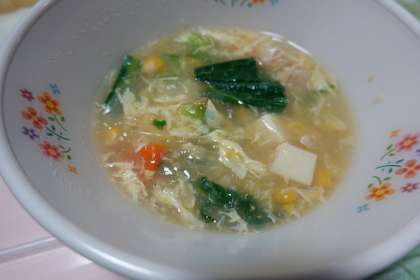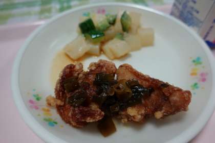 米飯、牛乳、鶏肉の薬味ソースがけ、カクテキキムチ、玉子とコーンのスープ