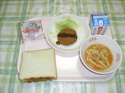 学年末テストの1日目の給食メニューは、パン、牛乳、ミネストローネ、メンチカツ、ボイルドキャベツ、ガトーショコラです。
