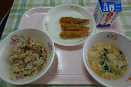 クープジューシー、牛乳、小イワシフライ、麩と玉子の汁物