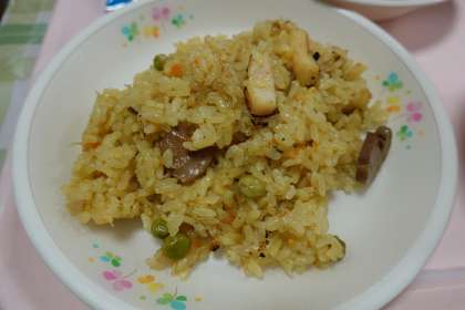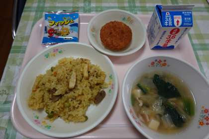 シーフードピラフ、牛乳、海老芋コロッケ、ベーコンと野菜のスープ、アーモンド小魚