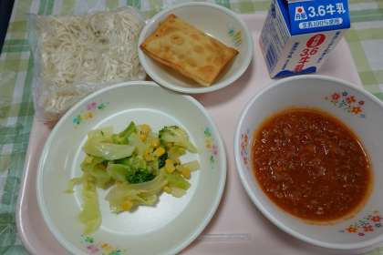 今日は、給食の人気メニューソフト麵ミートソースです。