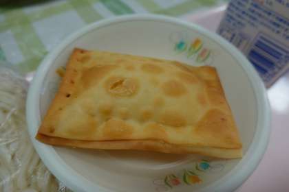 ソフト麵、牛乳、ミートソース、ボイルドサラダ、きんとんパイ