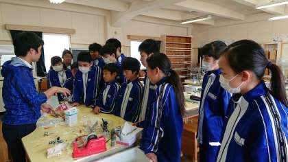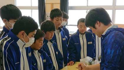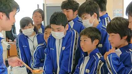 2年生は理科で「物質の成り立ち」という単元を学習しています。今日は、炭酸水素ナトリウムの性質を利用して、カルメ焼きを作る活動を行いました。最初に北垣先生を手本を示しています。