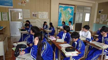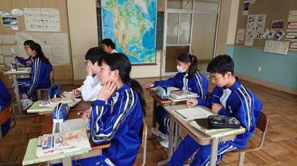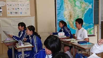 1年生は英語で「Program2アメリカからの転校生」について学習しています。渡部先生からの質問に、生徒は英語で答えていました。