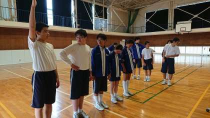 3年生は体育で集団行動を行っていました。グループごとに、姿勢・方向転換・集合・整とん・列の増減・開列・行進・足踏み・礼など、課題に合わせた動きを行っていました。