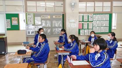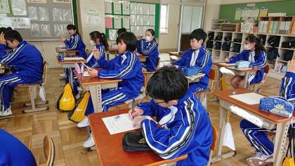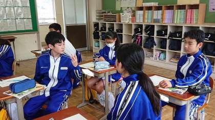 1年生は国語で三行詩作りを行っていました。短い文章で思いを込めるにはどうしたらよいか、みんなで意見を出し合いました。