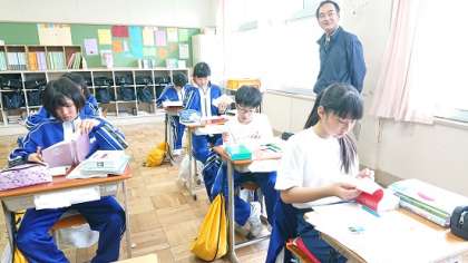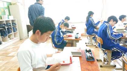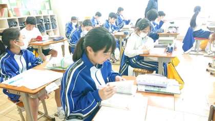 1年生は国語で「字のない葉書」について学習しています。新出語句の意味調べを行っていました。
