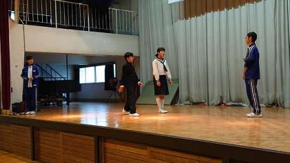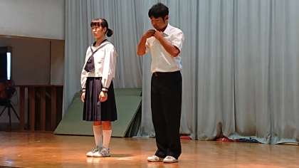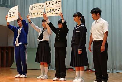 今朝、生徒集会がありました。生活健康委員の生徒が、あいさつ・服装などについて寸劇を行うなどして、全校生徒に伝えました。