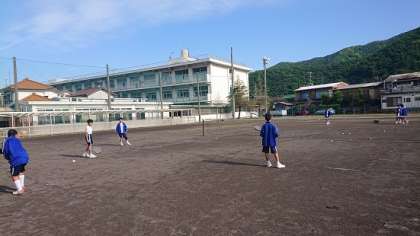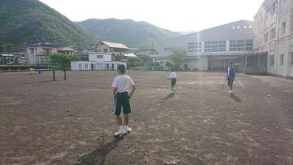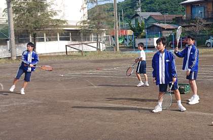 ソフトテニス部の朝運動の様子です。青空の下、気持ちよくプレイしています。