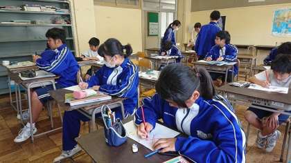 2年生は美術でピクトグラムを行っています。みんな丁寧に作業を行っています。