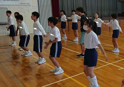 1年生は体育でラジオ体操を行った後にフォークダンスを踊りました。