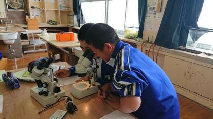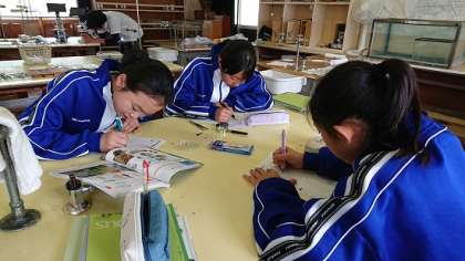 昨日の1年生理科の様子です。顕微鏡を使って、松の雌花と雄花の観察を行いました。