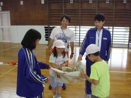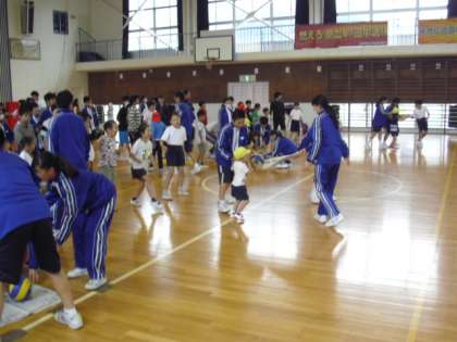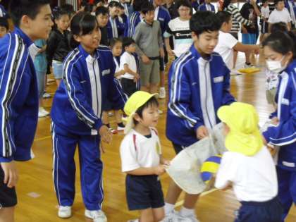 スローガンをみんなで確認した後、4つのスーパーはあと班対抗、ボール運び競技を行いました。4班が優勝しました。