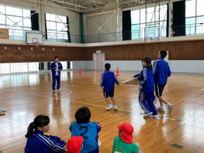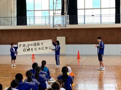 昼休みに幼保小中合同集会を戸田中体育館で行いました。へだっこセンターの年長さん、戸田小児童、戸田中生徒を4つの縦割り班「スーパーはあと班」に分かれ、6月6日に行われる御浜交流をはじめとする交流活動の顔合わせを行いました。