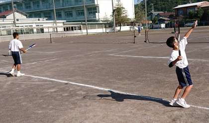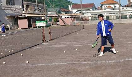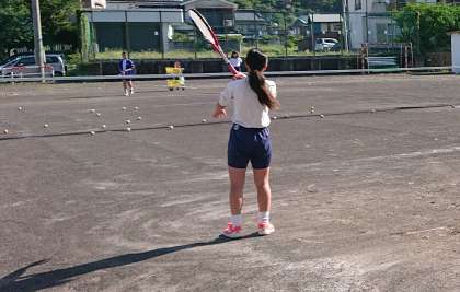ソフトテニス部の朝運動の様子です。朝からボールをたくさん打ち込んでいます。