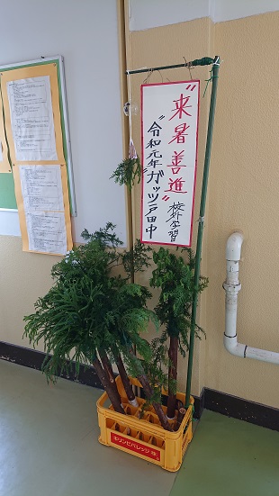 校外体験学習に向けて、児童生徒支援員の巻口先生と生徒がキャンプファイヤー用のトーチを作ってくれました。1階廊下に飾らせていただきました。ありがとうございました。