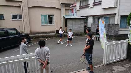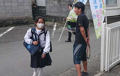 生活健康委員が朝のあいさつ運動を行っていました。教員も一緒に立ち、一人ひとりに声をかけています。