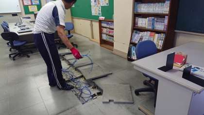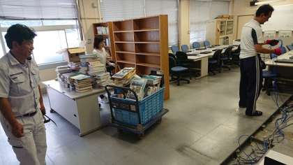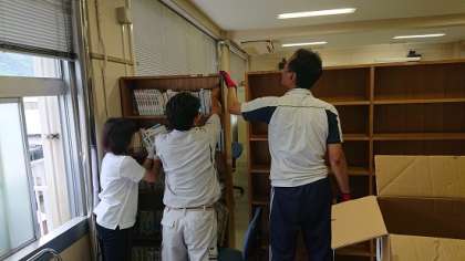 2学期からの小中共同生活に向け、今日は学校図書館の本棚をパソコン室に移動しています。本棚から本を段ボールに詰め込んだ後、段ボールと棚をパソコン室に運び、本棚を設置し本を並べるという作業を行いました。用務員さんやスクールサポートスタッフさんが中心になって作業を進めています。