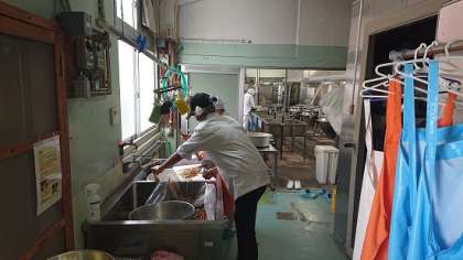 今日から5日間の日程で、本校で「高校生職場体験実習」が始まりました。田方農業高校の2年生が給食室で調理場実習を行っています。
