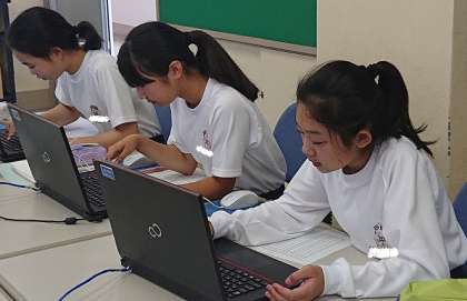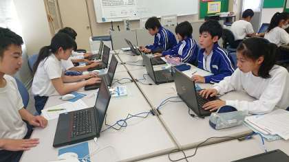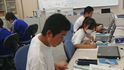 1年生は技術で「情報通信ネットワークの利用」という教材を学習しています。今日はコンピュータ室のパソコンで、キーボード練習ソフトを使って打ち方を学習しました。
