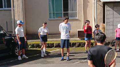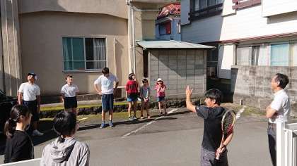 生活健康委員の生徒と戸田小学校児童会代表、教員が玄関先で「朝のあいさつ運動」を行っています。子どもたち同士で元気に声を掛け合っていました。