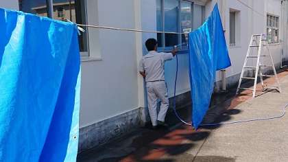 先日の御浜交流で使用したブルーシートですが、用務員さんを中心に土などを洗い流した後、日光のもとに干す作業を行いました。