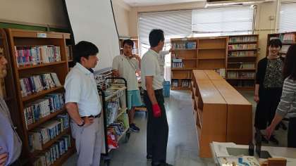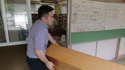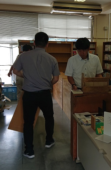 2学期からの小中共同生活に向け、今日は学校図書館の本棚をパソコン室に移動しています。少しずつパソコン室の半分が図書室に替わってきています。