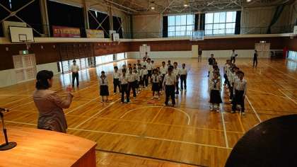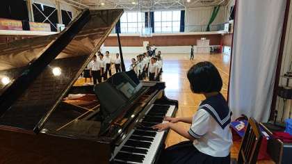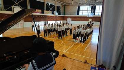 校長先生の話の後に校歌を斉唱しました。毎回、3年生が上手にピアノ伴奏を行っています。ありがとうございます。