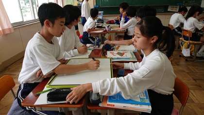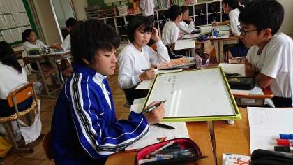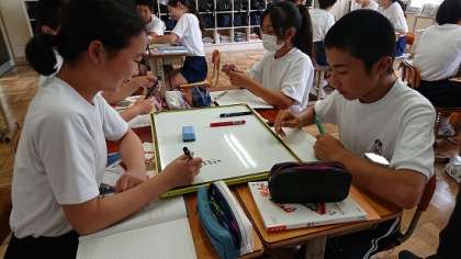 1年生は数学で「正の数・負の数」について学習しています。グループごとに平均をまとめる方法を考え、ホワイトボードにまとめていました。