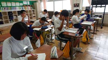 3年生は期末テストに向けて、試験対策勉強会を開いていました。ペアで問題を出し合う姿も見られました。