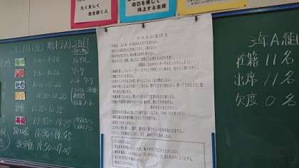 3A黒板を撮影しました。期末テストのスケジュール、注意事項等を書いてあります。