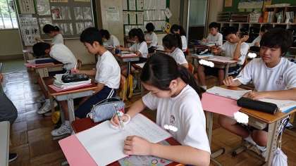 1年生は英語で「自己紹介ができるようになろう」という単元を学習しています。基本の文章を参考にしながら、それぞれが英語の自己紹介文を考えました。