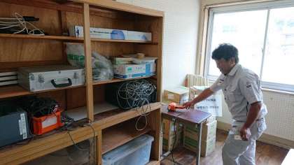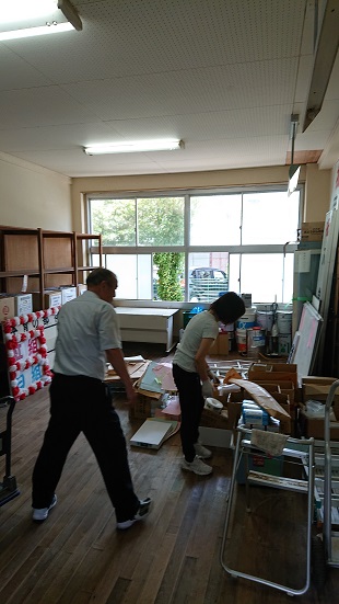 今日は、用務員やスクールサポートスタッフを中心に教材室備品を用務員室に移動しました。教材室は2学期から相談室として使用する予定です。