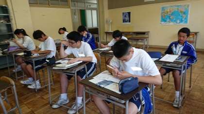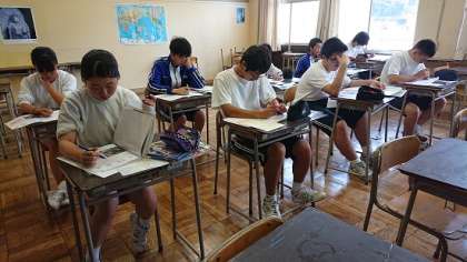 3年生は美術で期末テストの返却が行われました。間違っていたところを再度確認していました。