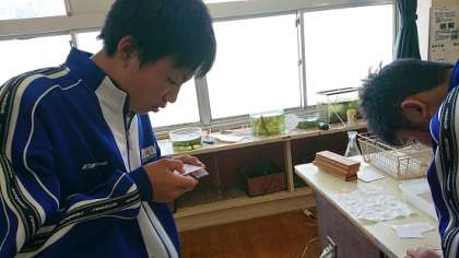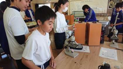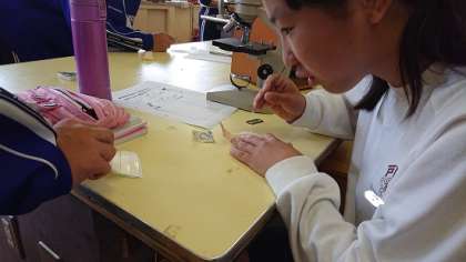 2年生は理科で「動植物の細胞のはたらき」について学習しています。今日は、実験を通して動物の細胞と植物の細胞の違いを見つける活動を行いました。