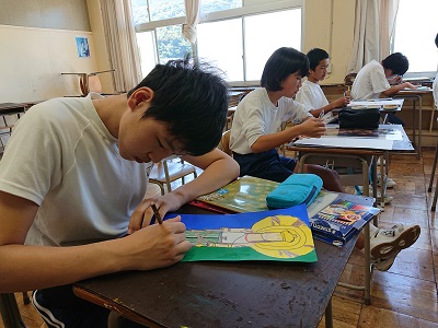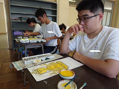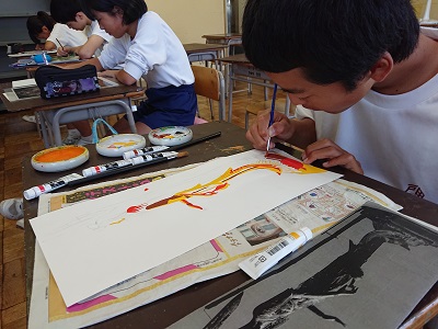 3年生は美術で仏像のデッサンを行っています。下書きした仏像に丁寧に色つけを行っていました。