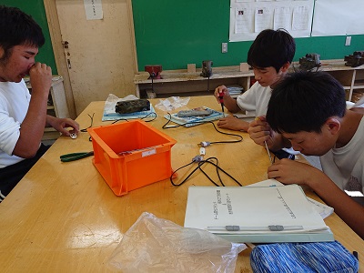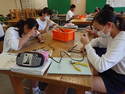 2年生は技術でドーム調光スタンドを作成しています。今日は電源コードの組み立てを行いました。みんな真剣に取り組んでいます。
