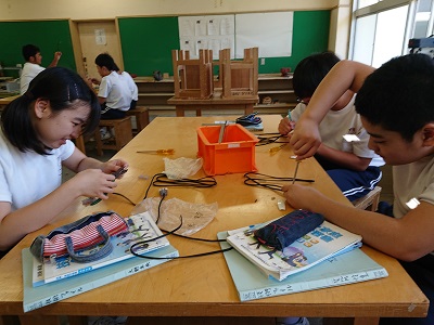 2年生は技術でドーム調光スタンドを作成しています。今日は電源コードの組み立てを行いました。みんな真剣に取り組んでいます。