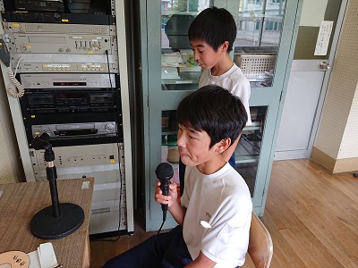 昼の放送の様子です。聞いている生徒が楽しくなるような番組をつくっています。