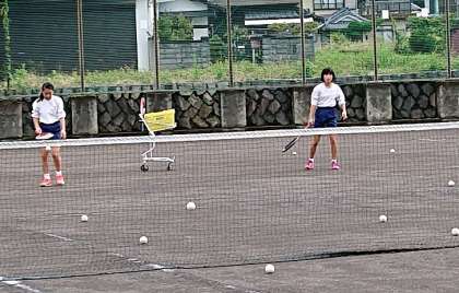 ソフトテニス部の朝練習の様子です。明日の沼津市総合体育大会(中体連)に向け調整練習を行っています。
