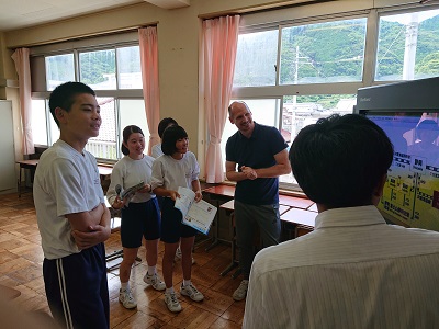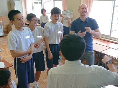 3年生は英語の時間に、ALTのアーロン先生に英語で道案内をしていました。