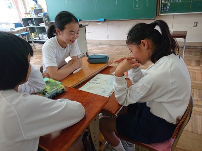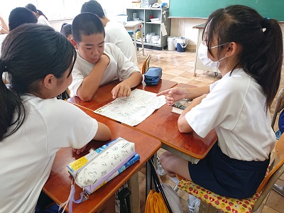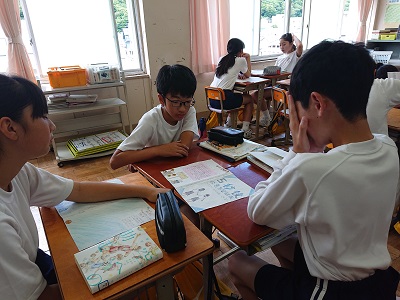 1年生は国語で「ブックカバーを作ろう」という学習を行っています。今日は評価ポイントを確認し、友達の作品を見合いました。