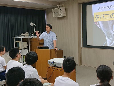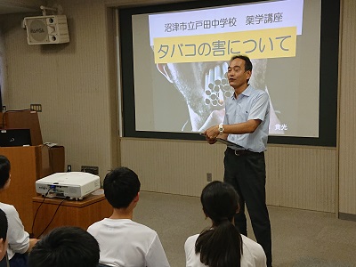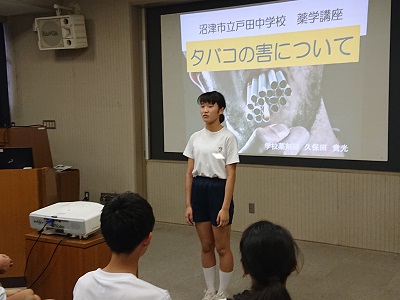 学校薬剤師である久保田先生に「タバコの害について」というテーマで講演していただきました。生徒は、タバコ・薬物がもたらす心身への影響を理解するよい機会となりました。