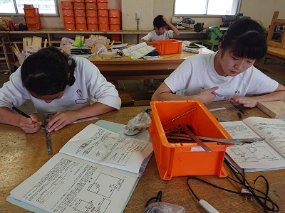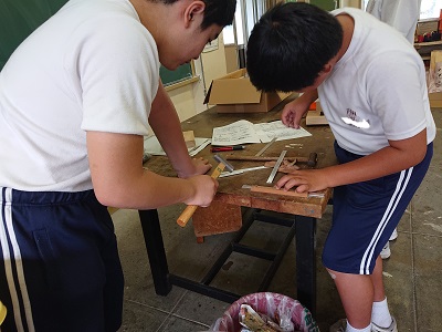 2年生は技術でドーム調光スタンドを作成しています。今日は木製台の穴加工、アルミ棒の加工を行いました。